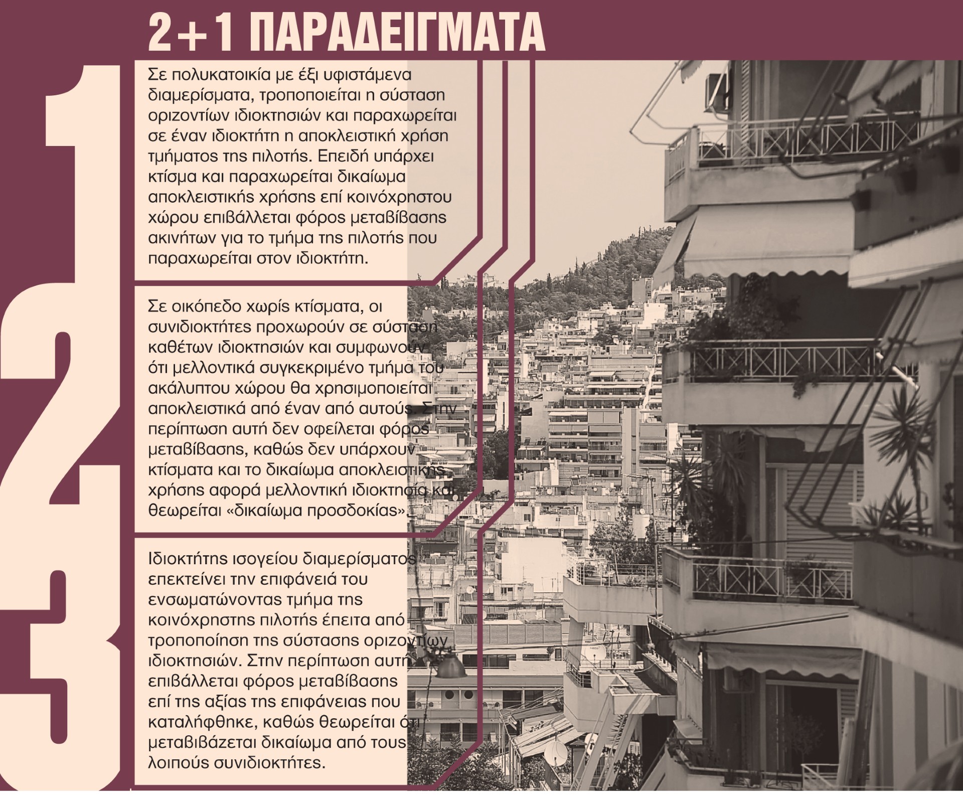- Παραχώρηση δικαιώματος αποκλειστικής χρήσης. Οταν με την τροποποίηση σύστασης οριζόντιων ή κάθετων ιδιοκτησιών παραχωρείται δικαίωμα αποκλειστικής χρήσης σε κοινόκτητο ή κοινόχρηστο χώρο (π.χ. τμήμα στην πιλοτή ή στο δώμα), οφείλεται φόρος μεταβίβασης.